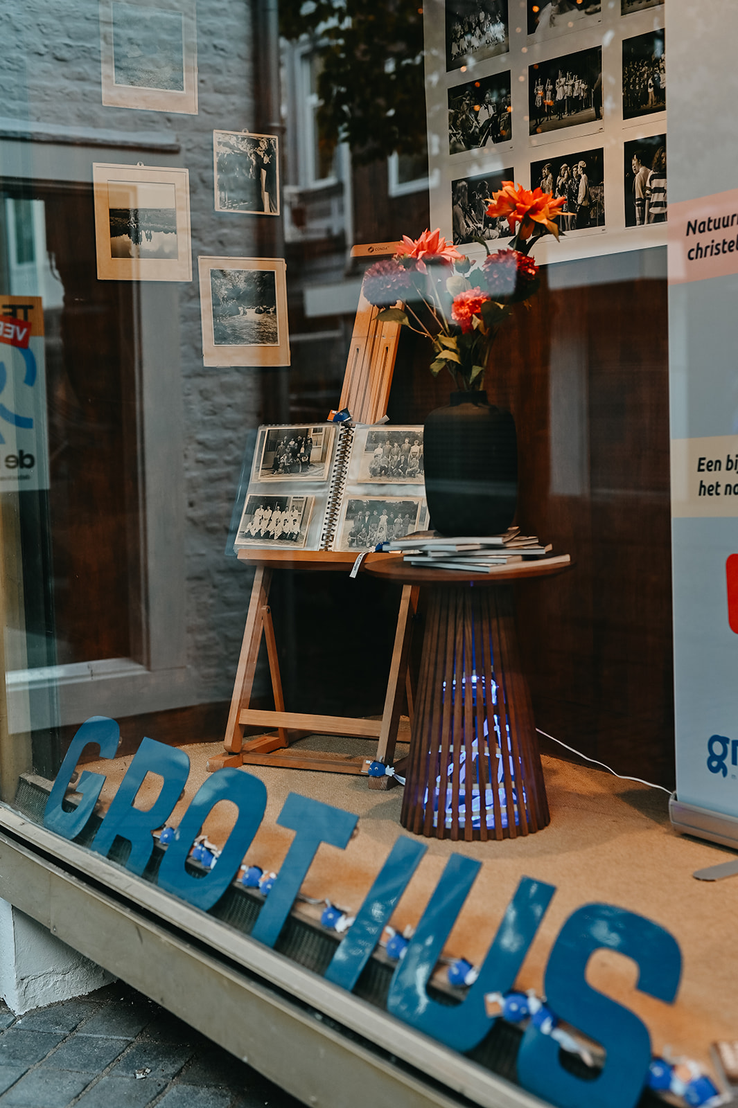 In samenwerking met Adopteer een etalage hebben drie leerlingen van het Grotius College fantastisch werk geleverd! Zij hebben de leegstaande etalage omgetoverd tot een prachtige weerspiegeling van onze school. Met oude foto’s, informatieve banners over Hugo Grotius en zelfs ons jubileumboek ter ere van 75 jaar Grotius College.