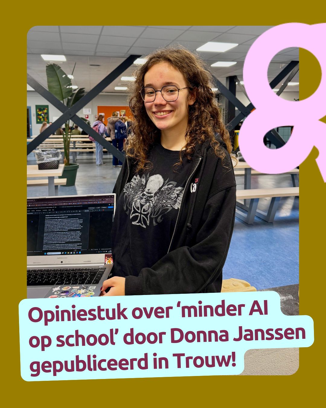 Wat begon als een gewone schrijfopdracht voor Nederlands, eindigde in een publicatie in een landelijke krant. Donna koos ervoor haar stuk in te sturen naar Trouw, en met succes: haar artikel ‘Graag minder AI op school, want we willen zelf leren nadenken’ werd geplaatst.