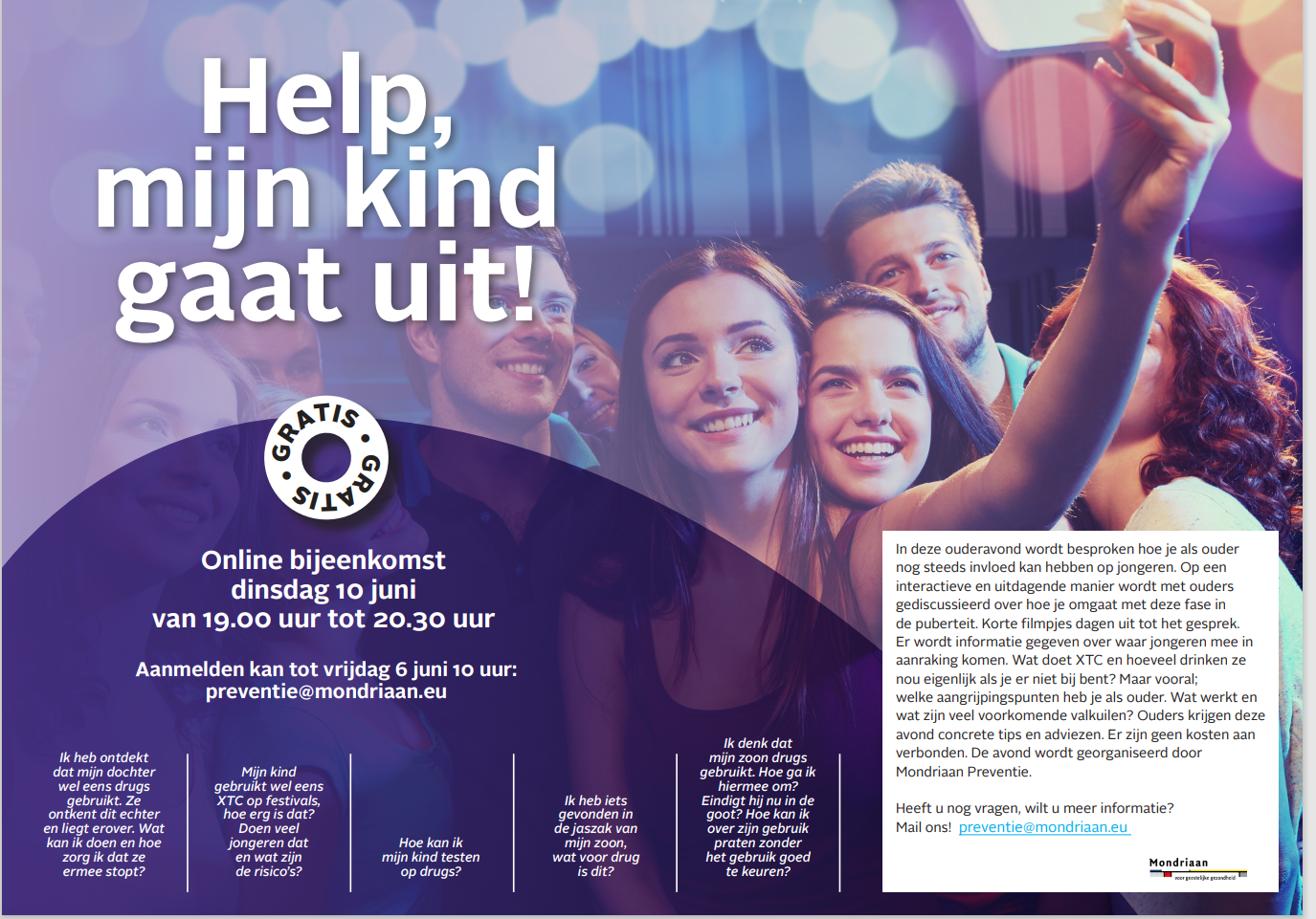 Aanmelden kan door een mail te sturen naar preventie@mondriaan.eu onder vermelding van Help mijn kind gaat uit. Na aanmelding ontvang je de link voor deelname.